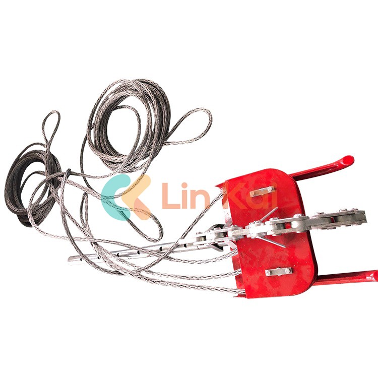 Planches de cordage de haute qualité de Lingkai pour quatre faisceaux de conducteurs sur le site de cordage de lignes aériennes. Les têtes de lecture sont utilisées pour le cordage des conducteurs regroupés et pour tirer sur les blocs de cordage. Nous avons conçu et réalisé des marchepieds à 2, 3, 4, 6 et 8 conducteurs. Il existe deux types de marchepieds, selon les exigences du client. L'un est le type à fixation et l'autre est le type à équilibre avec une poulie centrale et un câble de traction en fil d'acier.