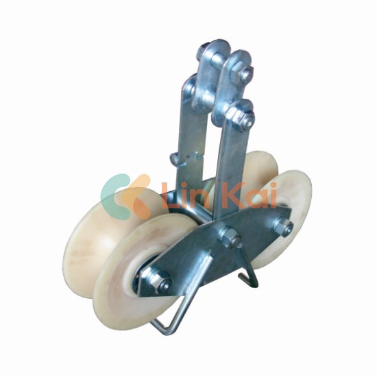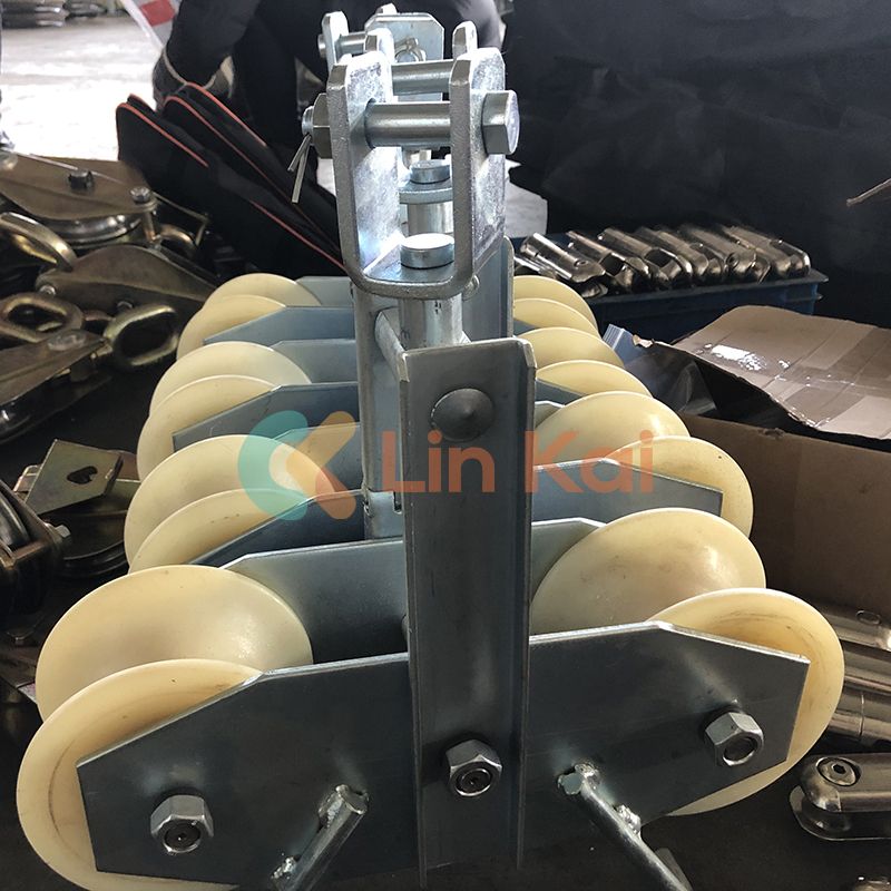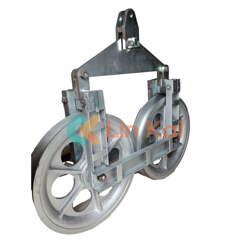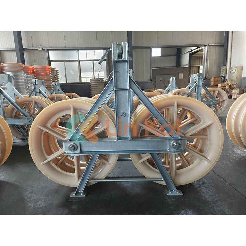 Application : Les blocs de cordage à poulie tandem sont utilisés pour corder un seul conducteur ou OPGW sur une tour de tension avec une grande section de portée ou sur une tour d'angle. Il est composé de rouleaux à double réa.